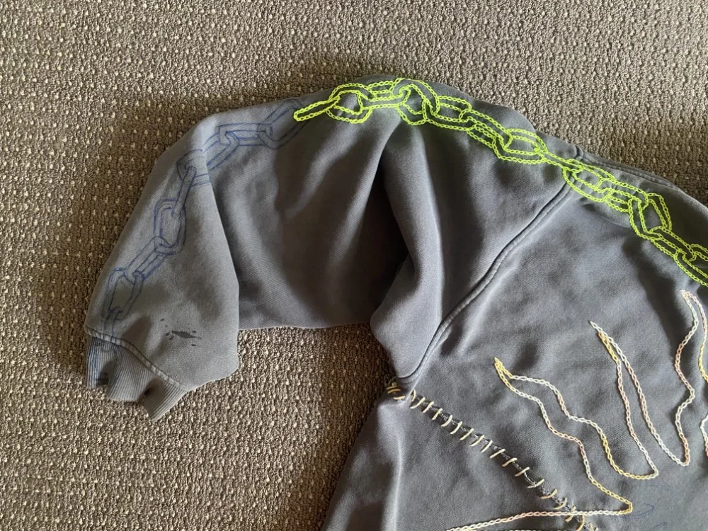 The grey hoodie is from an op shop. I chopped the middle out to shorten the length and then hand-stitched it back together, making a feature of the join. I chose designs to embroider pretty pragmatically, mostly inspired by the shape of the garment. The abstract, natural design in pale yellow I chose because it’s a motif I often doodle and because I thought it would sit well on the garment. The chain design I chose because I wanted something that signified connection and solidarity to me. I also just like imagery that evokes the industrial and chains looks cool. Especially in fluro yellow.